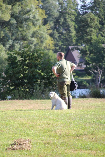 Die Prüfung begann mit 2 Feldmarkierungen. Danach ging es Frei-bei-Fuß zum nahegelegenen See. Dort legten die Hunde mit 2 Wassermarkierungen die Wasserprüfung ab. Vom See aus ging es zur letzten Prüfung des Tages, der Freiverlorensuche.